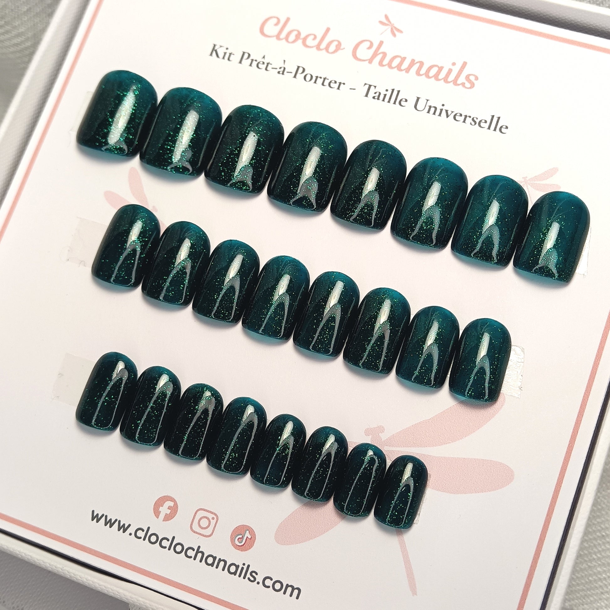 Ce kit contient un modèle de Press On Nails de teinte vert nuit parsemée de micro-paillettes pour un éclat subtil. Un style chic, affirmé, qui magnifie la main avec une intensité hypnotique. Forme carré court