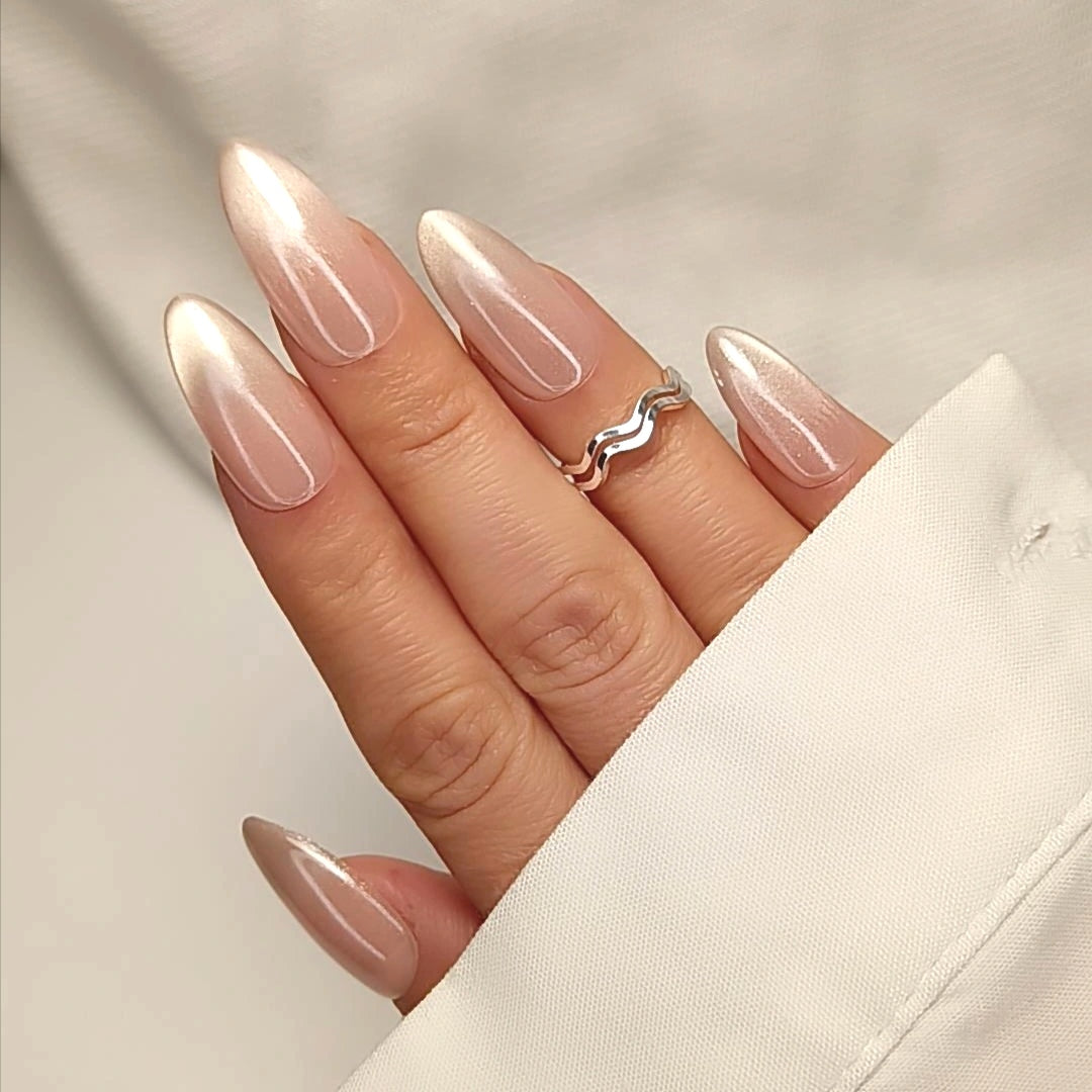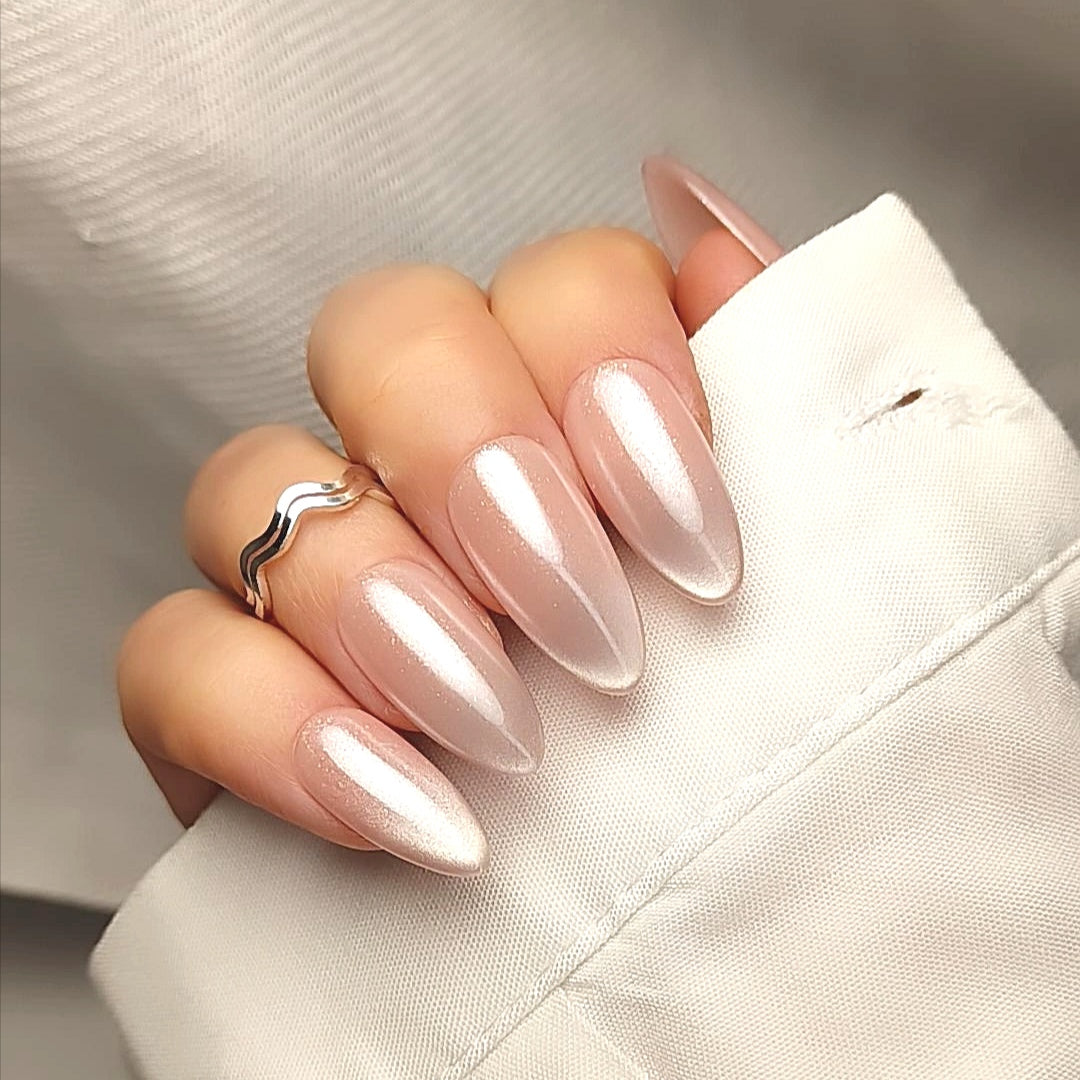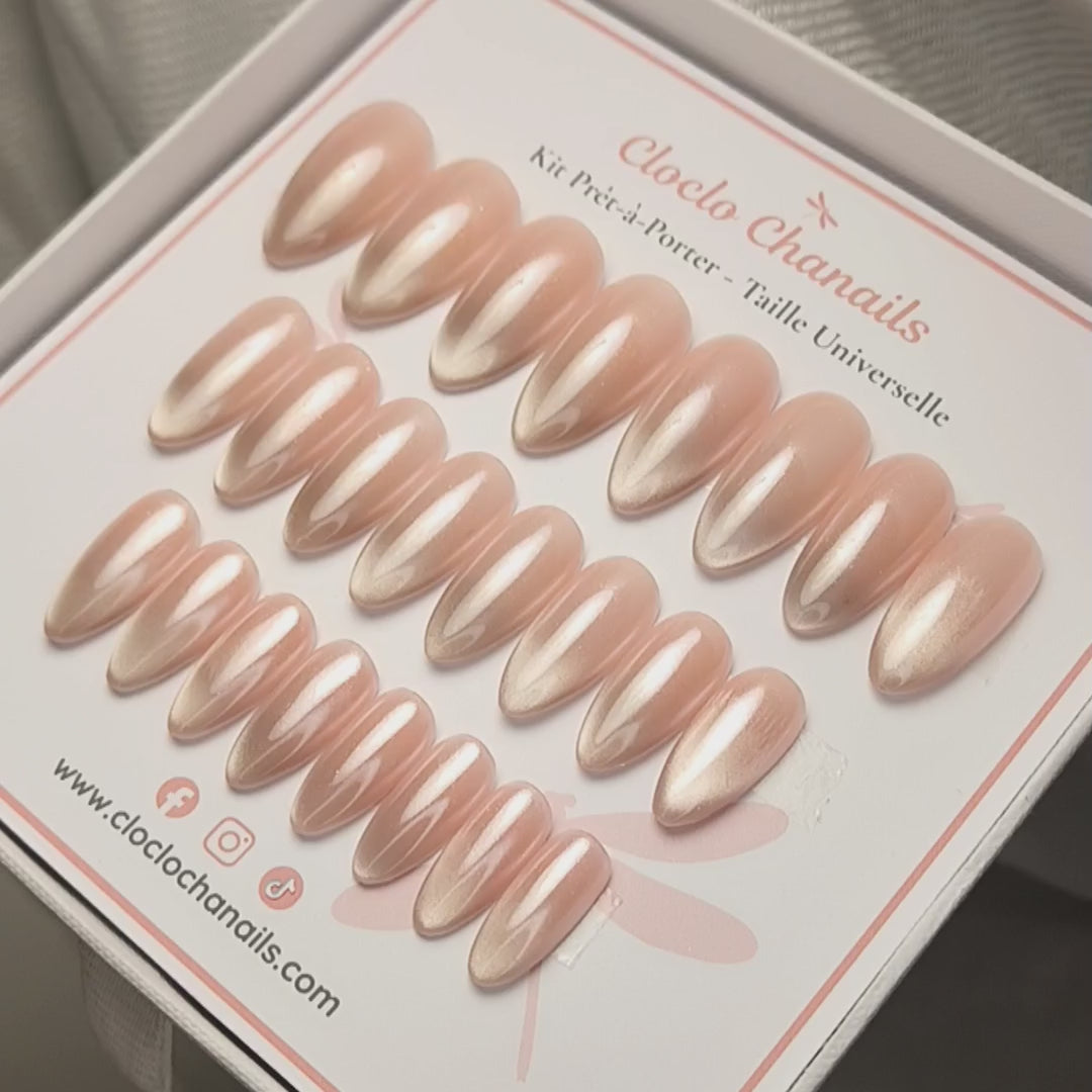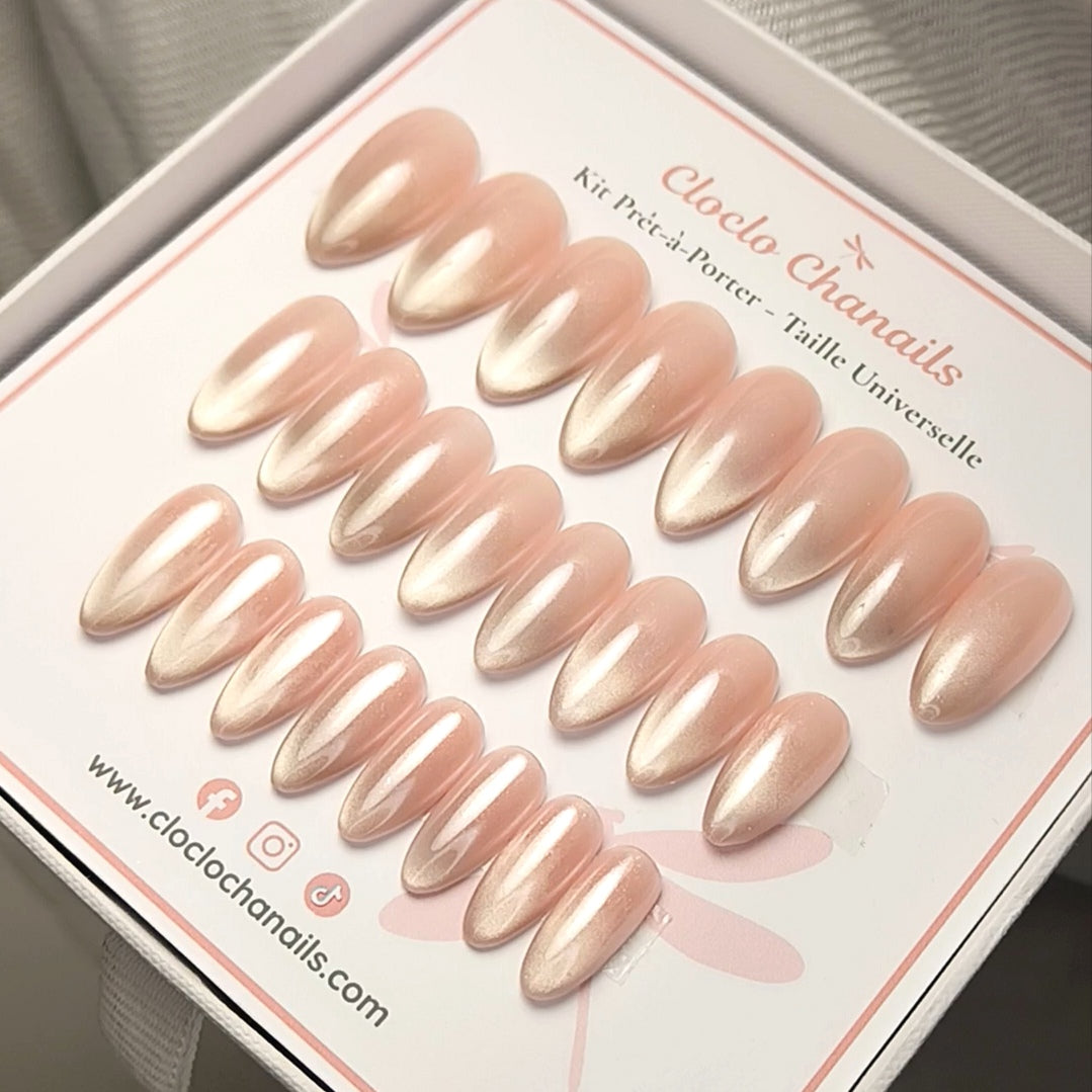 Ce kit contient un modèle de Press On Nails nude nacré qui diffuse une lueur satinée grâce à son effet cat eyes. Un rendu délicat, raffiné, parfait pour une féminité subtile et intemporelle. Forme amande médium