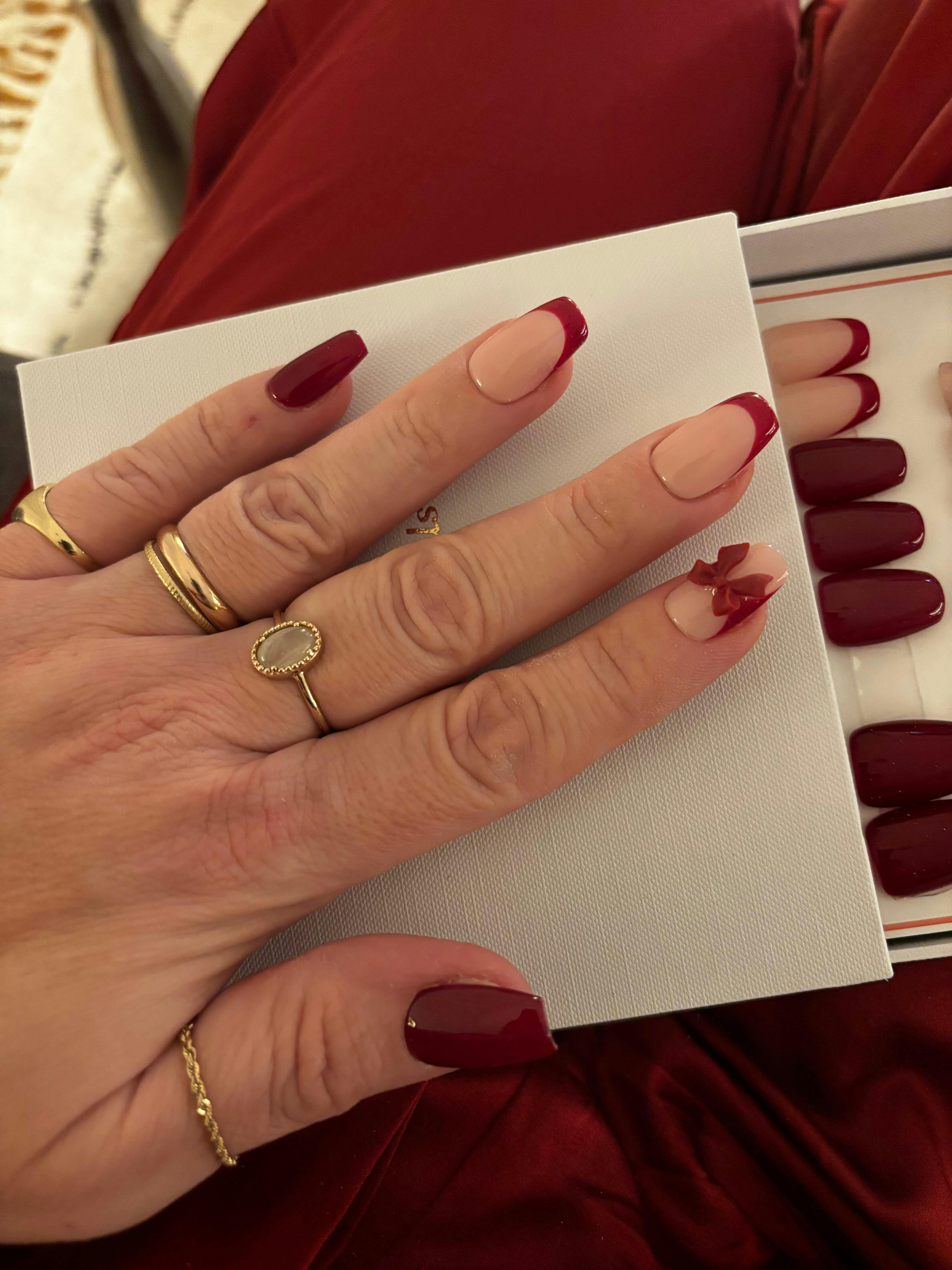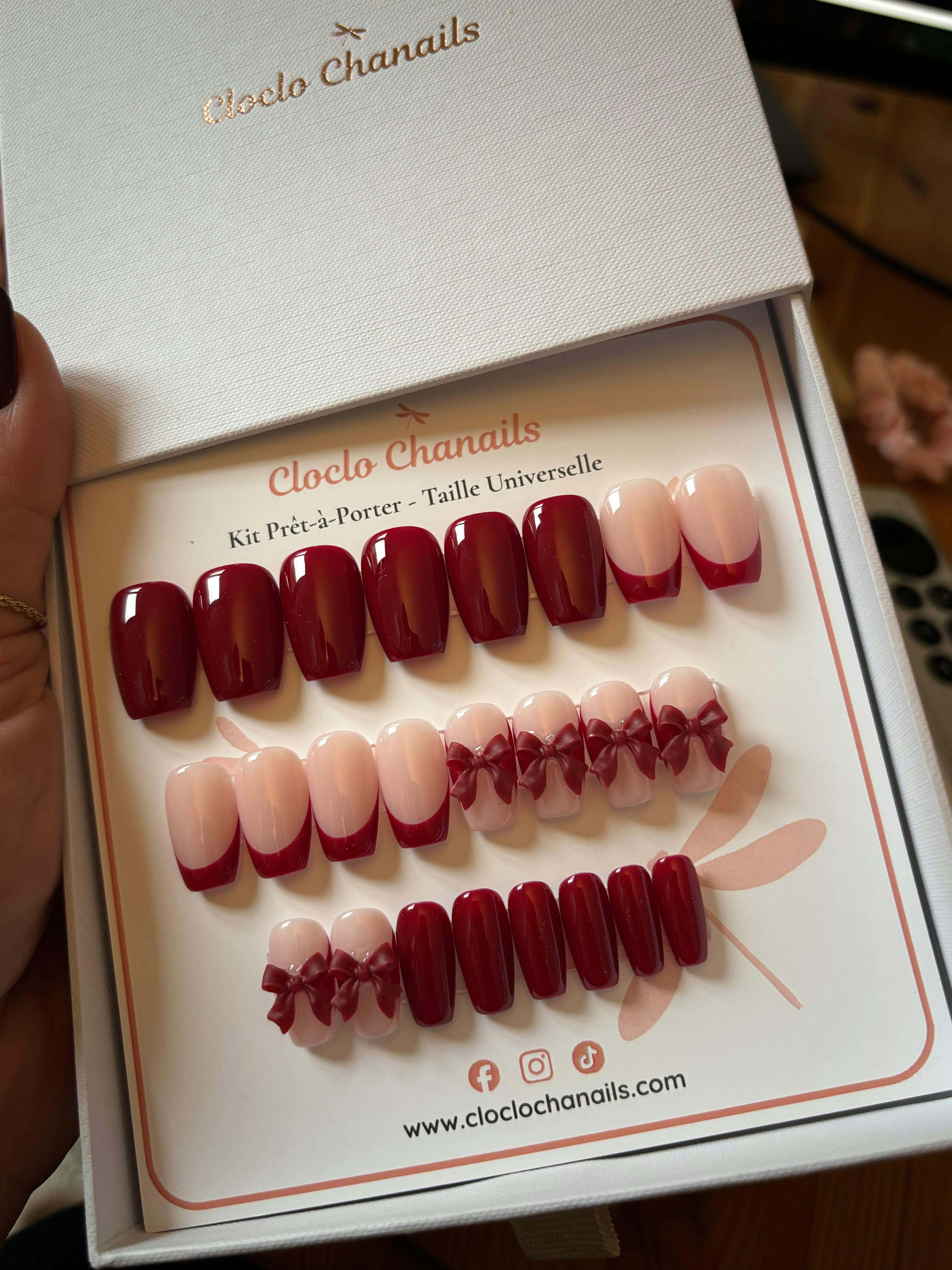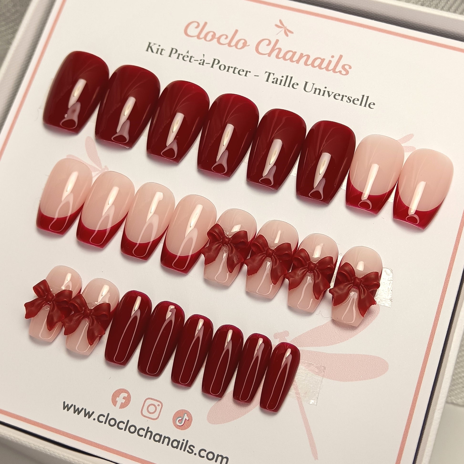 Ce kit contient un modèle de Press On Nails avec une French rouge intense sublimée par un petit nœud sculpté pour un charme instantané. Un équilibre parfait entre sophistication et douceur romantique. Forme coffin court