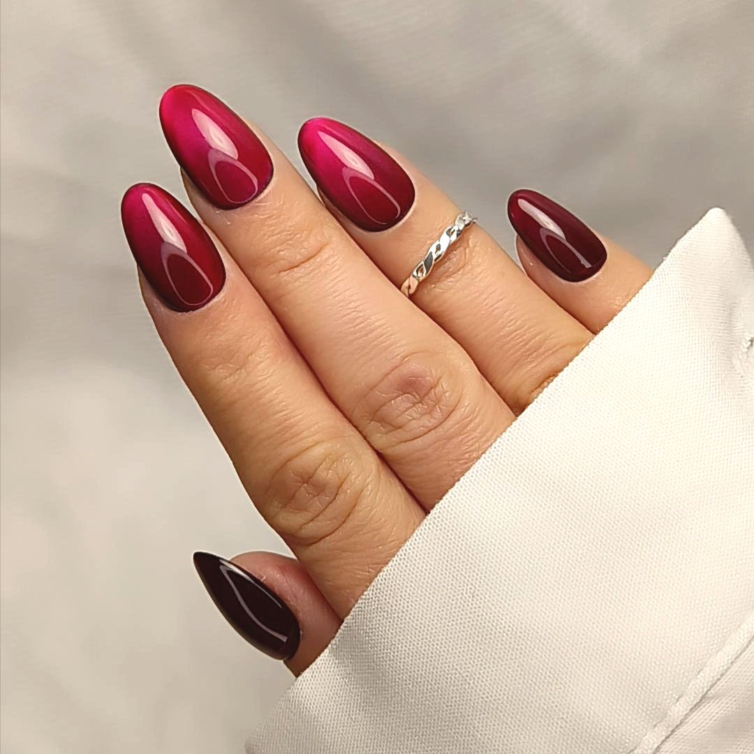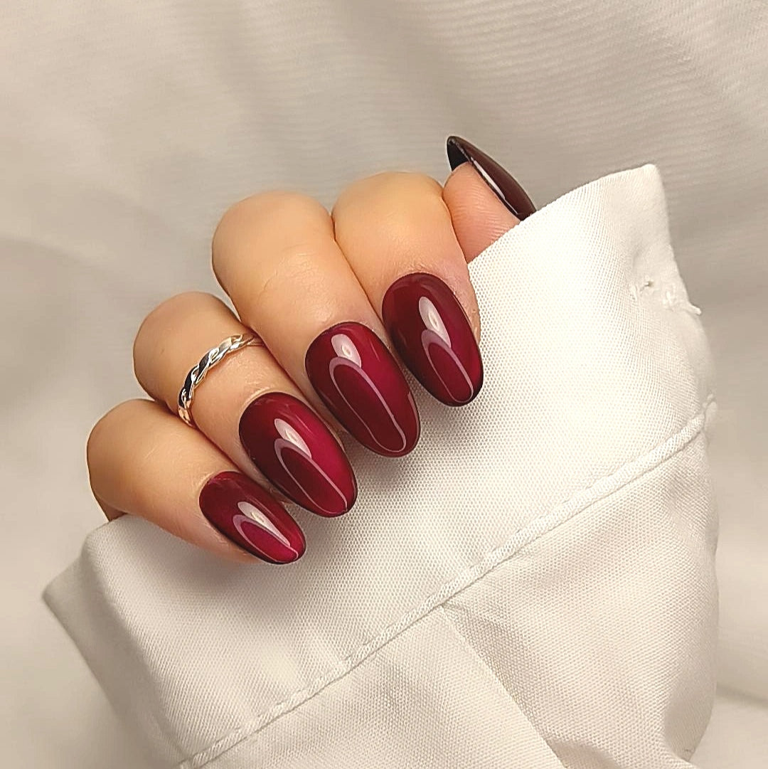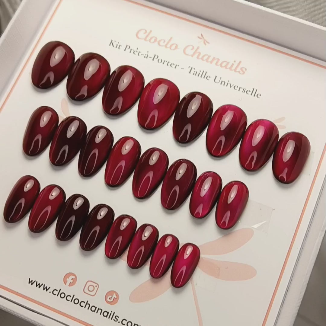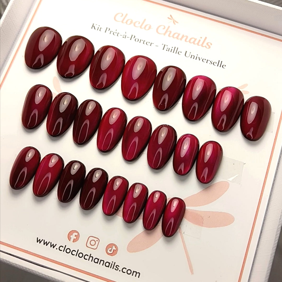 Ce kit contient un modèle de Press On Nails rouge profond avec un effet cat eyes qui accroche la lumière dès le premier geste. Un look féminin instantané, élégant, qui transforme la main en bijou en quelques minutes. Forme rond court bombé